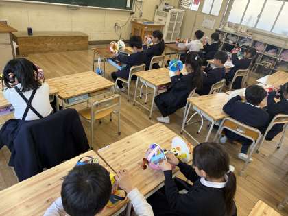 図工で紙皿と紙コップを使って「かざわ」(風で動くおもちゃ)を作りました。紙皿や紙コップに思い思いに色づけしました。さらに画用紙でくるくる巻いたものや、階段みたいに折ったものを飾りつけして、素敵な作品になっていました。完成した後は、みんなで広い多目的室に行って、かざわを転がして楽しみました。
