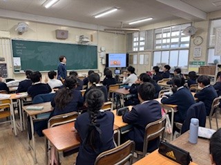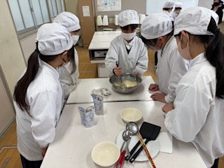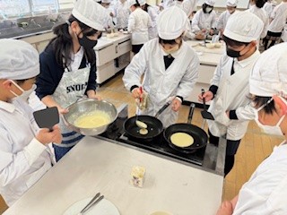 家庭科「いっしょにほっとタイム」の学習で、パンケーキを作りました。教室で作り方の説明を聞いて、家庭科室で調理しました。みんなで仕事を分担して仲良く作っていました。