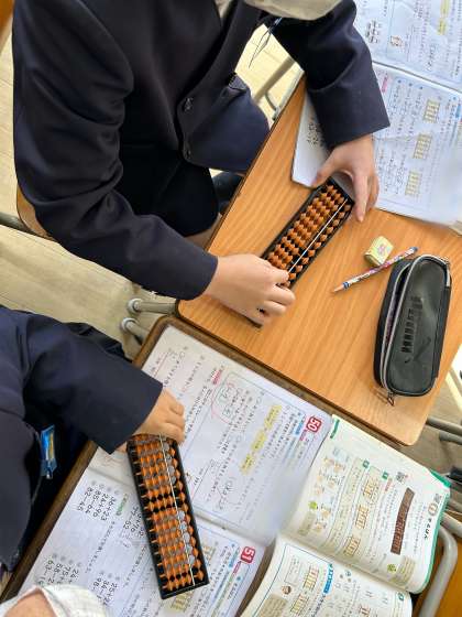 算数の授業でそろばんの学習をしました。そろばんで繰り上がり、繰り下がりの計算をしました。普段のひっ算とは違い、上の位から玉を入れていくので、苦戦していましたが楽しそうにそろばんに触れていました。