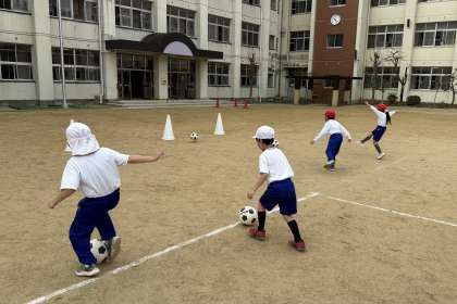 1年生の体育で、「ボールけり運動」をしています。はじめは、ボールを蹴ってとめるパスもなかなか上手にできなかった1年生ですが、今では上手にパスできるようになりました。コーンの的に当てるシュートやボールを蹴りながら走るドリブルも上達しました。赤白に分かれて簡単なミニゲームもしています。
