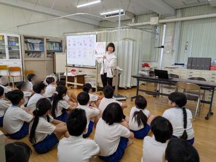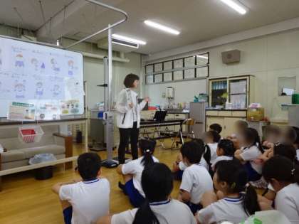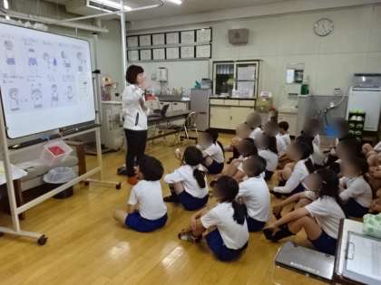 今日は発育測定がありました。保健室の使い方や健康的な生活を送るために大切なこと、そして運動器検診でチェックしたい内容についてお話を聞きました。
