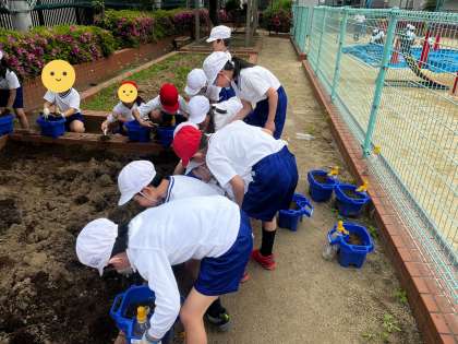 生活科の学習でトマトを育てる準備をしました。草抜きをして、土を耕し、自分の植木鉢に土を入れました。