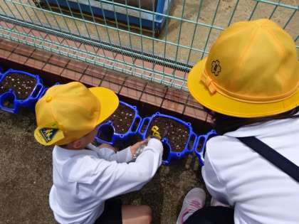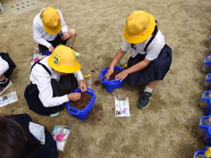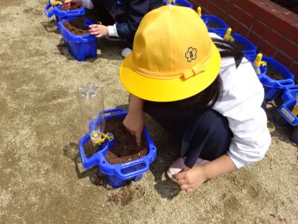 生活科の学習で、あさがおの種を植えました。植木鉢に土を入れて、種をまいて、水やりをしました。何色の花が咲くのか楽しみです。休み時間には、とても嬉しそうな表情で水やりをしに行っています。