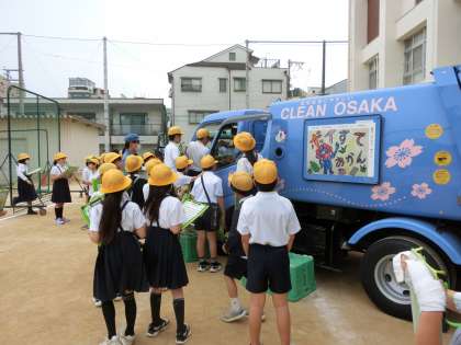 大阪市西北環境事業局からパッカー車が2台学校に来ました。