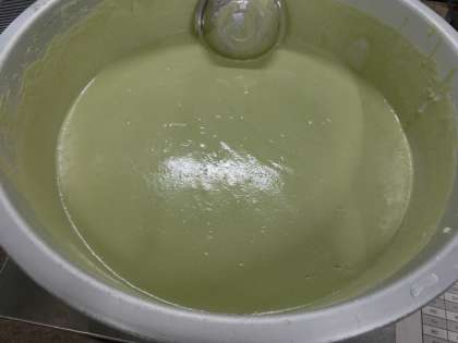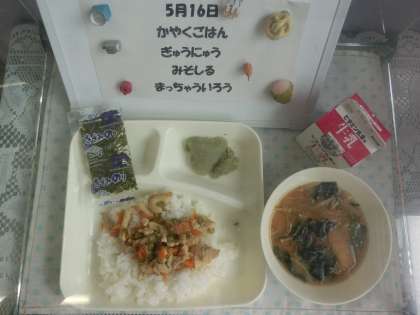 5月16日の給食は「かやくごはん、牛乳、みそ汁、まっちゃういろう」でした。まっちゃういろうは、上新粉、抹茶、砂糖、水を混ぜ合わせて蒸して作っています。給食室で手作りのまっちゃういろうは、子どもたちに大人気でした!