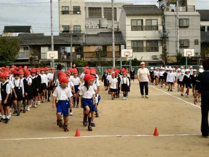 台風27号が接近しています。この情報をもとに、本来は、今日はいつも通りの朝会の予定でしたが、急きょ本日の朝会の内容を変更して運動会の全体練習をしました。突然の変更でしたが、教職員はもちろん、子どもたちもすばやく対応することができました。