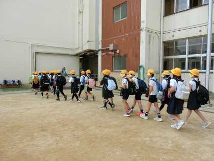 運動場で学年集合をしてから、8時55分に学校を出発しました。