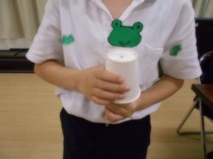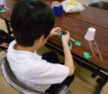 今日のひまわりタイムは「ゲコゲコかえる」を作りました。一人ひとり自分の個性がひかるかえるの顔を描きました。ストローを上下させると、「ゲコゲコ〜。」と鳴きながら両手を振るので、子どもたちは大喜びでした。