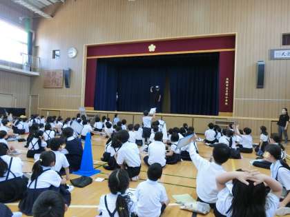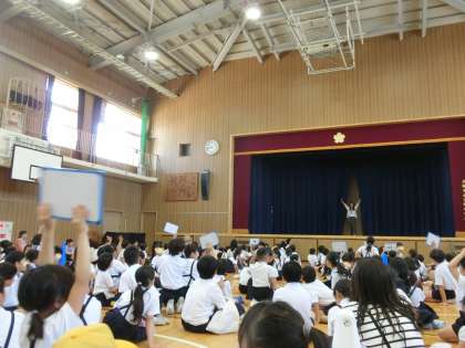 今日の児童集会は、たんぽぽ班に分かれて「先生クイズ」を行いました。