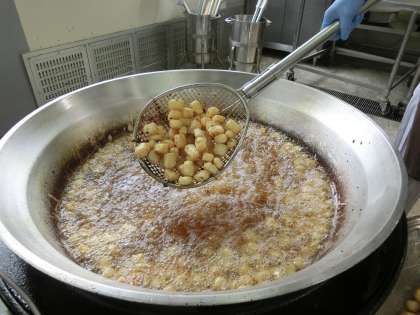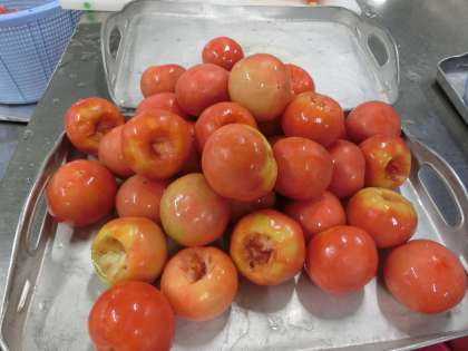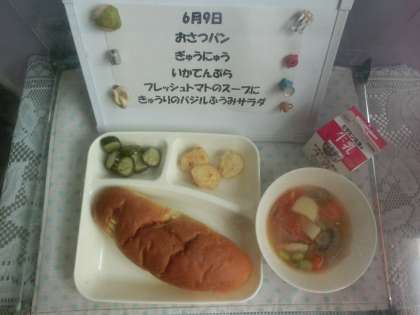 6月9日の給食は「おさつパン、牛乳、いかてんぷら、フレッシュトマトのスープ煮、きゅうりのバジル風味サラダ」でした。今日のスープ煮は、生のトマトで爽やかな味に仕上がっていました。一口サイズのいかてんぷらは、カラっと揚がって好評でした。
