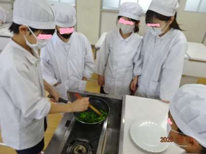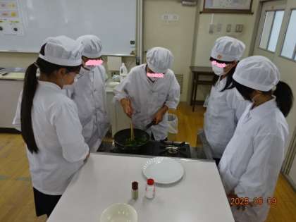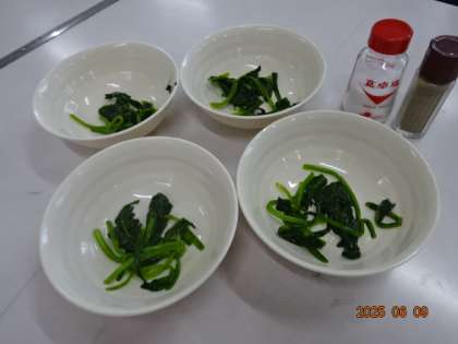 今日は、家庭科の学習で「ほうれん草のソテー」をつくりました。ほうれん草の生の状態、ゆでた時、炒めた時を比べました。火を通すにつれて、かさが小さくなることがわかりました。最後にみんなでおいしく試食しました。