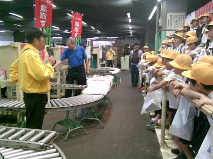 今日は朝早くから「中央卸売市場」に見学に行きました。最初は、果物のセリ体験をしました。リンゴのセリを体験させていただき、最後はお土産で一人一個のリンゴをいただきました。水産コーナーでは、エビやアワビをご厚意で触らせていただいたり、「吉野小学校のみなさん、ようこそ!」と看板を作って迎えて下さったちりめんじゃこの売場の方など様々な仕事に携わっている方と触れ合いました。その後、野菜売り場に行って、みんなでビデオを見て帰校しました。幸い、天気は最後まで持ちました。今後の社会科の学習に活かせるといいですね。
