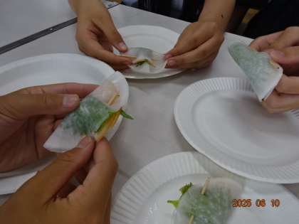 教室で鳥取から全国に出荷されている食べ物の話や、らっきょうを育てる様子など、いろいろなお話を聞きました。最後に、家庭科室に移動して「らっきょう」でつくった料理を試食しました。初めて食べる子もたくさんいましたが、おいしくいただきました。