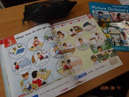 今、6年生は、「What’time do you get up?」の学習をしています。質問のしかたや答え方をがんばって練習しています。みんな覚えが早くて、先生にほめられていました。