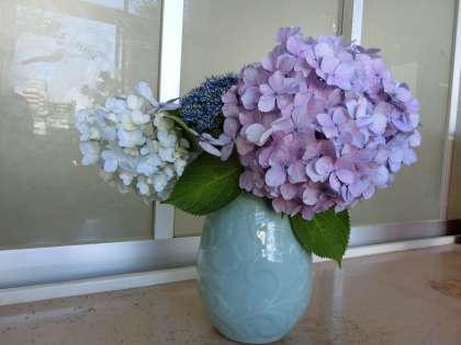 保健室前、校長室前にあじさいを飾っています。