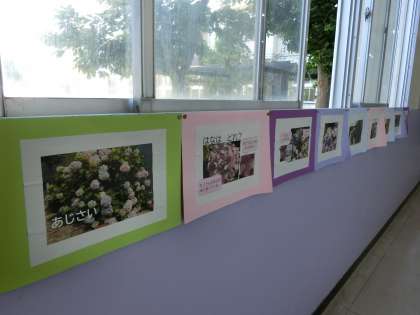 校長室前の廊下には、全校朝会の時に校長先生から話のあった「あじさいの花」のスライドショーを掲示しています。