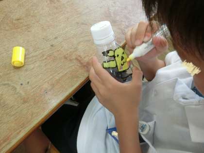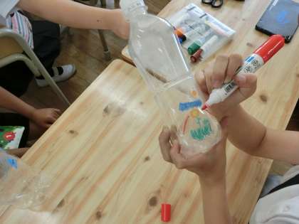 ペットボトルにかわいいキャラクターやカラフルな絵を描きました。