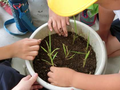 バケツの土に4〜5ヶ所程度指で押し込みくぼみを作ります。