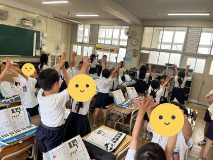 友達と顔を見合わせて、楽しそうに歌っていました。