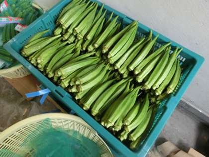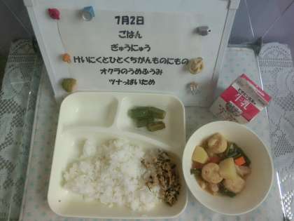 今日の給食は「鶏肉と一口がんもの煮もの、オクラの梅風味、ツナっ葉いため」でした。昨日のゴーヤに引き続き、今日も夏野菜のオクラが出ました。梅肉で食べやすく、食欲をそそる味つけでした。