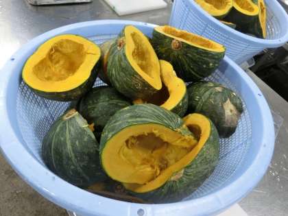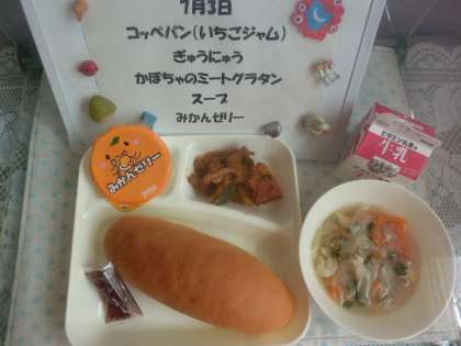 7月3日の給食は「かぼちゃのミートグラタン、スープ、みかんゼリー」でした。今日も夏野菜のかぼちゃを使った献立でした。かぼちゃは硬いので、切るのがとても大変!でも、かぼちゃの入ったミートグラタンはとてもおいしく大好評でした。冷たいゼリーもとてもおいしかったです。