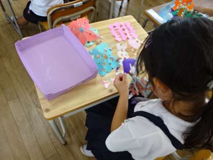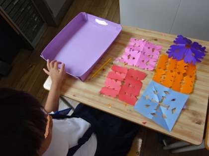 図画工作科の授業で、折り紙を折って、ハサミでちょっきんと切り、パッと折り紙を開くときれいな模様ができました。色々な模様に切って、ワクワクしながら折り紙を開いていました。