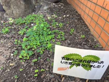 正門のそばで、おじぎ草が芽を出しています。昨年度のこぼれ種から、自然に育ったそうです。子どもたちは、登下校の際、立ち止まり葉に触れています。