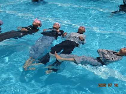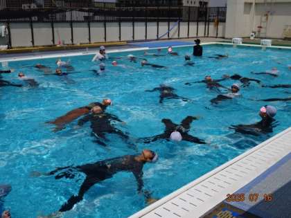 命を守るために、服を着た状態で水に入る体験をしました。服を着ていると、水をたくさん含んで重たくなり、泳ぎにくくなることを感じました。体を浮かすために、ペットボトルを使ったり、服に空気を入れたりと、工夫する様子が見られました。