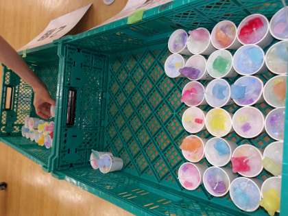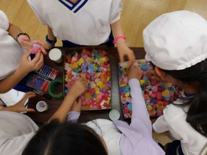 色とりどりのきれいなワックスを使って、それぞれの個性あるキャンドルを作りました。林間学習の思い出の作品ができました。