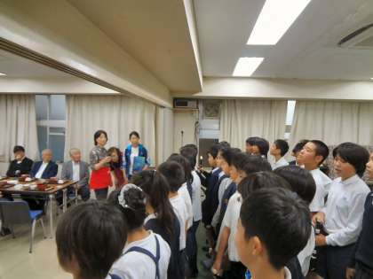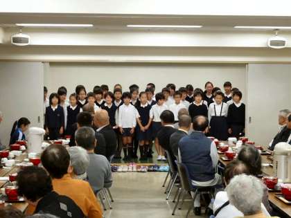 吉野小学校では、2つの地域があります。先日に引き続き今回は、吉野地域のお年寄りとの交流に5年生が行きました。交流先の吉野コミュニティーでは、多くのお年寄りたちに「いつもありがとうございます」の気持ちを込めて、笛の合奏『ランチタイム・マーチ』の演奏と『ビリーブ』を歌いました。お年寄りの方々も笑顔でこたえてくださいました。