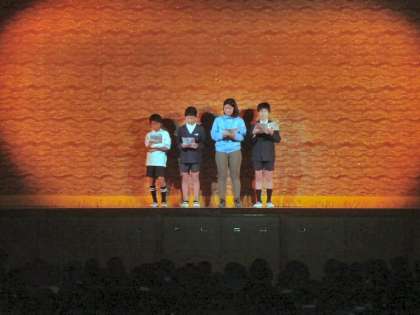 本日、劇団民話芸術座の『河童の笛』をみんなで鑑賞しました。演劇は、第1部と第2部に分かれ、第1部では、6年生児童と先生が出て、演劇教室がありました。内容は、ある星から来た河童が人間世界に溶け込もうと努力するお話ですが、最後には、理解し合えたことに対して、感激して涙している子どももいました。