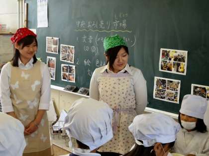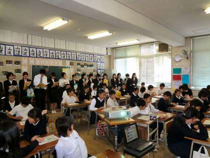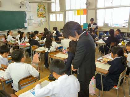 11月1日(金)に教職実践演習の学生さん(相愛大学発達栄養学科の4回生)がこられました。子どもたちへのあいさつが済むと、各教室での授業を見学したり、給食を一緒に食べたりと子どもたちと触れ合ってくださいました。