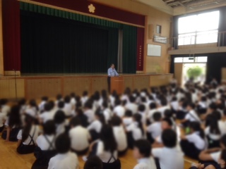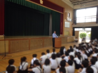 5月25日は、吉野小学校の第105回の創立記念日です。朝会で地域の方に昔の学校の様子をお話していただきました。