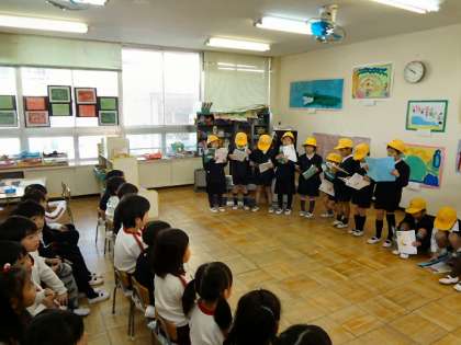 12月3日に西野田幼稚園と1年生の交流がありました。1年生は、国語科で学習した『サラダで元気』を劇風にして朗読をしました。幼稚園の先生が子どもたちの成長を喜んでくださいました。最後には、ゲームして互いに楽しみました。