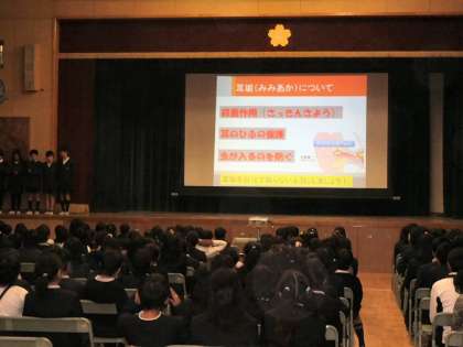 12月5日に本校講堂において学校保健委員会がありました。出席は、校医の先生方、保護者の方々、本校教職員、そして、4年生5年生6年生の児童です。テーマは、『耳・鼻・のどの健康』ということで、保健委員会の子どもたちが、調べたり確かめたししたことを分かりやすくスクリーンを使って発表してくれました。そのあと、各校医の先生方からテーマに関してのお話をいただきました。