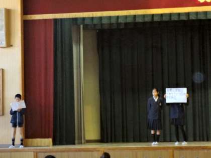 1月23日(木)児童集会で『○×クイズ』をしました。問題としては、先生の好きな食べ物や在校生の人数など自分たちの身近な問題が○×で取り上げられていました。答えを集会委員の人たちが発表するごとに子どもたちから歓声が上がっていました。