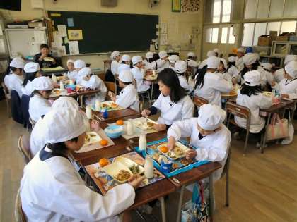 1月20日(月)〜24日(金)の1週間、給食に関心をもったり、給食に携わる方々へ感謝したりする『学校給食週間』がありました。月曜日には、給食委員の人たちが、昔の給食をテーマに自分たちで取材したことを発表してくれました。そして、金曜日には、1年と5年、2年と6年、3年と4年がそれぞれ一緒の教室で給食をとる『交流給食』をしました。これ以外にも、給食調理員さんへの感謝の手紙やどのように食べたかなどを記す各カードを作成していました。