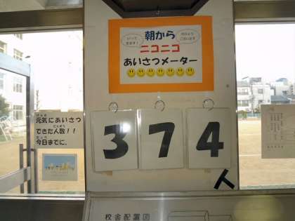 吉野小学校では、保護者や地域の方々と連携しながら子どもたちのあいさつを大事に指導しています。各学期ごとにこのように強調週間を設けて実施しています。2学期の時には、元気にあいさつできた数が、『442名』でした。3学期は、この数字を越えようとがんばりました。その発表は、2月10日(月)の朝会時に代表委員会から発表されるとのこと。さて、どうだったかな?と楽しみです。