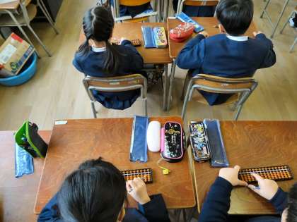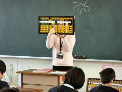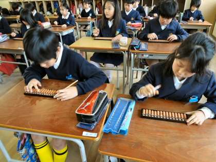 今日は、3年生でそろばん講習がありました。全国珠算教育連盟大阪府支部の田中先生がお出でくださり、丁寧に教えてくださいました。子どもたちは、お年玉の計算など普段の生活に生きるテーマに楽しく取り組んでいました。