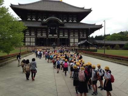 奈良についてからは、鹿や景色を見ながらまず東大寺大仏殿に入り中を見学しました。その後は、グループに分かれてオリエンテーリングをしました。二月堂を回りゴールは浮雲園地です。多少道に迷ったグループもあったようですが、5・6年生が力を合わせ全員無事にゴールに到着しました。