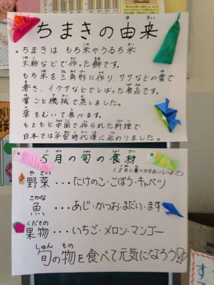 この日に合わせ、給食調理員さんが、「ちまきの由来」をまとめ給食室に掲示してくれています。それを給食室に来た子どもたちが熱心に読んでいました。