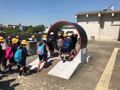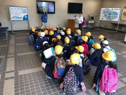 大きな配水管を見ました。お水はこの中を時速4キロメートル、人間の歩くスピードと同じくらいの速さで流れているそうです。お水になったつもりで配水管の中を歩いて、高度浄水処理施設に行きました。