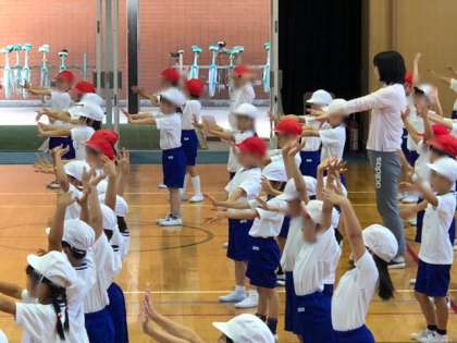 運動会に向けて、それぞれの学年で練習が始まりました。1年生も2年生といっしょにダンスの練習です。みんな一生懸命に踊っています。