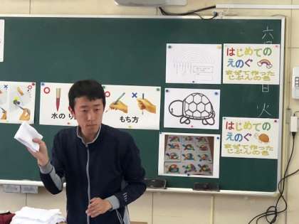道具の置き方や水の入れ方など、決まりを確認しました。ワクワクドキドキ、これから、いろいろな絵を描くことができると思います。楽しみですね。