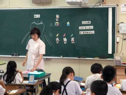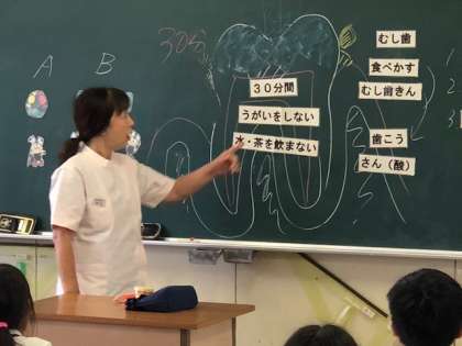 4年生は、フッ化物塗布の前に、歯と歯肉の健康について学習しました。歯科衛生士さんに教えていただきました。この後、歯科校医先生にフッ化物塗布をしていただきました。