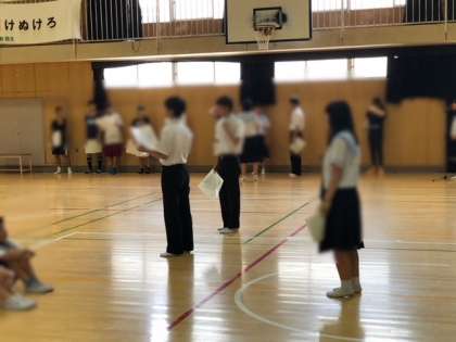 体育館では、中学校のお兄さんお姉さんが、出迎えてくれました。中学校生活について説明してくれました。