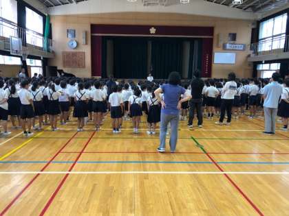 今日から、朝会を講堂で行います。今月の目標についてお話がありました。今月の目標は「学校を美しくしよう」です。