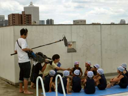 本日、BS-TBSから3年生が水泳指導の取材を受けました。本校では、泳ぎを高めるために『クロール25』という水泳指導補助具を使って指導しています。ビート板やヘルパーに比べて泳ぐことに近い水泳指導補助具です。子どもたちは、これを身に着けると、何か前より泳げるような気がすると意欲満々でした。