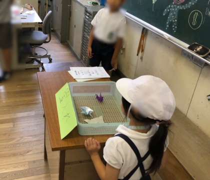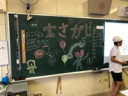 4-1教室では、宝探しをしています。折り紙で折ったお宝を見つけます。