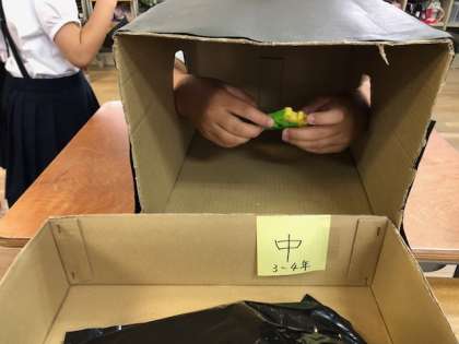 3-1の教室では、黒い箱の中に入っているものを当てるゲームです。中が見えない箱に手を入れて手触りだけで当てるのはとても難しいけれど、ドキドキワクワク楽しんでいます。